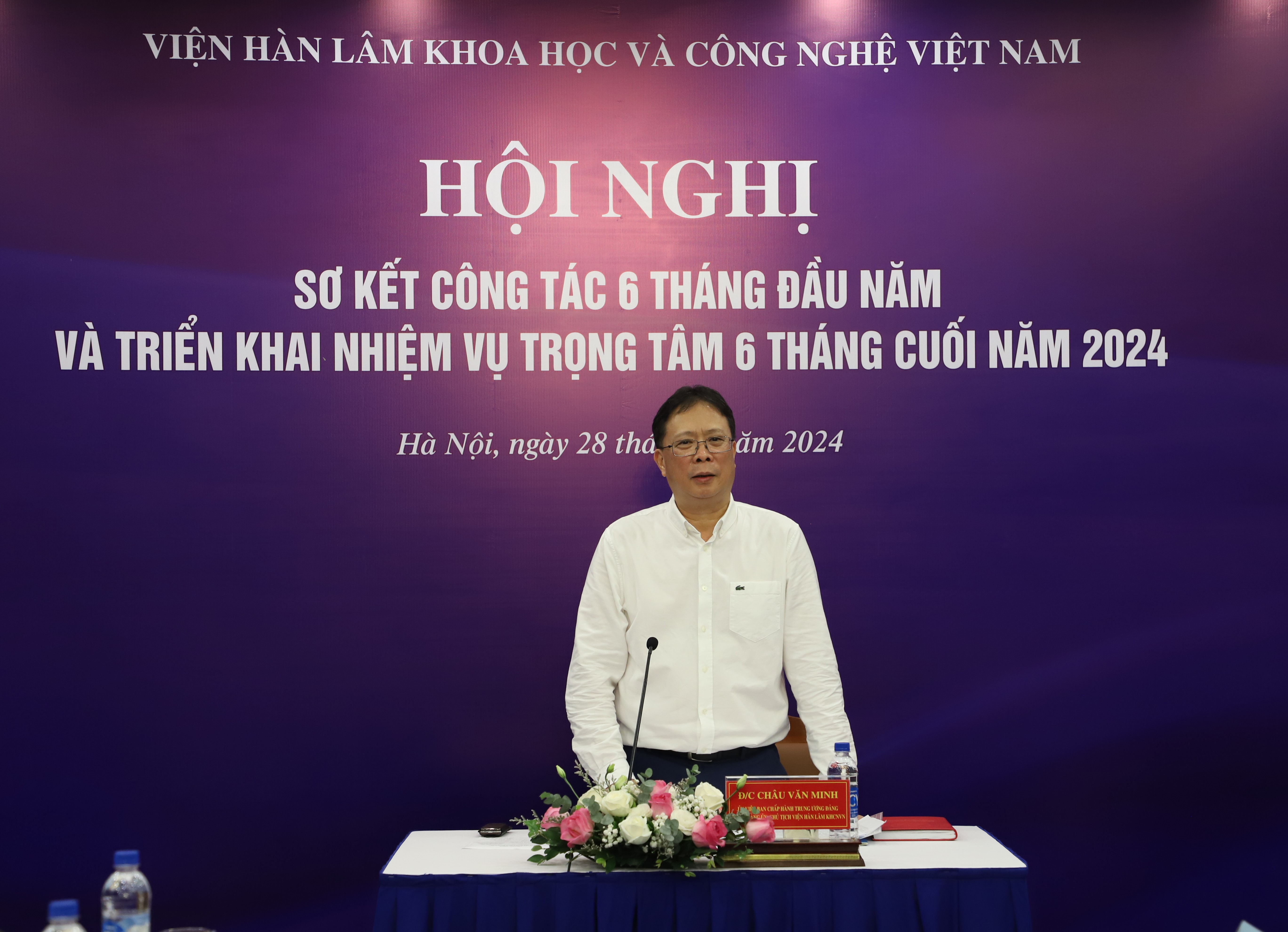 Ngày 28/06/2024, Viện Hàn lâm Khoa học và Công nghệ Việt Nam (Viện Hàn lâm) đã tổ chức “Hội nghị Sơ kết 6 tháng đầu năm 2024 và kế hoạch 6 tháng cuối năm 2024”. Tham dự và chủ trì Hội nghị có GS.VS. Châu Văn Minh - Ủy viên BCH Trung ương Đảng, Bí thư Đảng ủy, Chủ tịch Viện Hàn lâm; các Phó Chủ tịch Viện Hàn lâm; cùng đại diện lãnh đạo các đơn vị trực thuộc, Thường vụ Đảng ủy, Công đoàn và Đoàn Thanh niên Viện Hàn lâm.