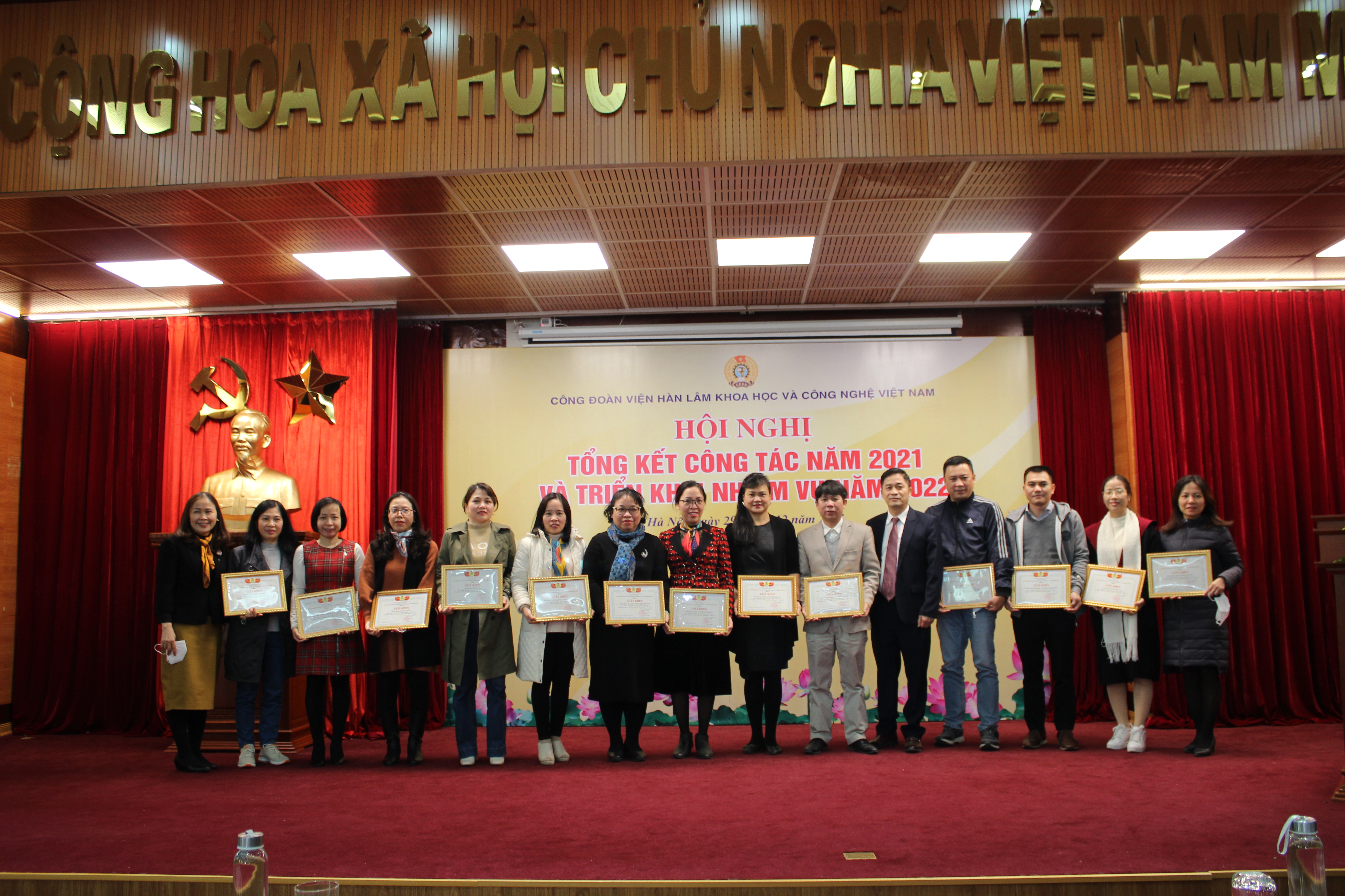 Về triển khai thực hiện các phong trào thi đua yêu nước: Các đơn vị trực thuộc tiếp tục thực hiện các phong trào thi đua do Viện Hàn lâm và đơn vị phát động. Ghi nhận kết quả thực hiện các phong trào thi đua, Công đoàn Viện Hàn lâm đã được Công đoàn Viên chức Việt Nam tặng bằng khen năm 2021. BCH Công đoàn Viện lâm tổ chức trao tặng Bằng khen của BCH Tổng Liên đoàn Lao động Việt Nam cho 01 tập thể và 02 cá nhân; trao tặng Cờ thi đua và Bằng khen của Công đoàn Viên chức Việt Nam 03 tập thể (01 Cờ thi đua, 02 Bằng khen) và 14 cá nhân; trao tặng Giải thưởng Gương mặt của năm 2020 cho 04 cá nhân tiêu biểu, xuất sắc.