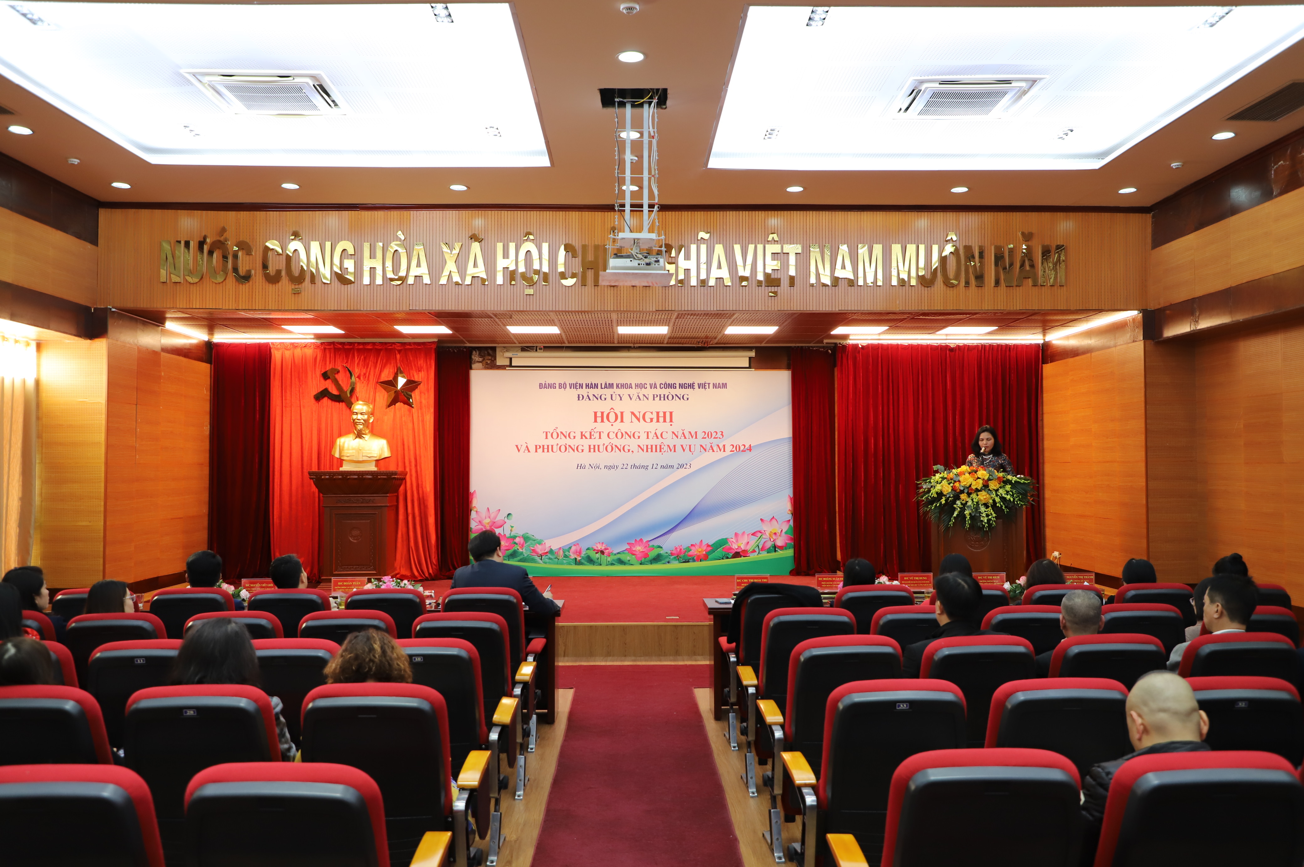 Chiều 22/12/2023, Đảng bộ Văn phòng Viện Hàn lâm Khoa học và Công nghệ Việt Nam (Đảng bộ Văn phòng) đã tổ chức “Hội nghị tổng kết công tác năm 2023 và phương hướng, nhiệm vụ trọng tâm năm 2024”. Đồng chí Lê Sỹ Tùng - Ủy viên Ban Thường vụ Đảng ủy Viện Hàn lâm, Bí thư Đảng bộ Văn phòng, Chánh Văn phòng chủ trì Hội nghị, cùng với sự tham dự của các đồng chí trong BCH Đảng bộ Văn phòng, Chi ủy các chi bộ trực thuộc và toàn thể đảng viên trong Đảng bộ Văn phòng.