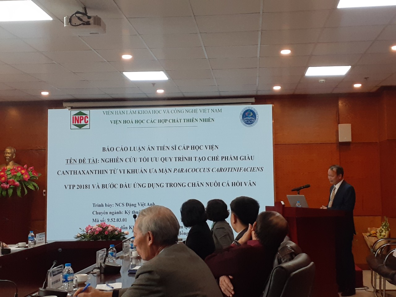 Ngày 26 tháng 12 năm 2022, tại Học viện Khoa học và Công nghệ đã diễn ra buổi Lễ bảo vệ luận án Tiến sĩ cấp học viện của Nghiên cứu sinh Đặng Việt Anh – Khoa Hóa học, chuyên ngành Kĩ thuật Hóa học (mã số: 9 52 03 01), đề tài luận án: “Nghiên cứu tối ưu quy trình tạo chế phẩm giàu canthaxanthin từ vi khuẩn ưa mặn Paracoccus carotinifaciens VTP20181 và bước đầu ứng dụng trong nuôi cá hồi vân” với sự hướng dẫn của GS.TS. Phạm Quốc Long và TS. Phạm Hồng Hải.