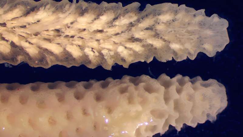 Mặt trong của một nhánh mổ xẻ của Acropora millepora cho thấy số lượng polyp san hô sản xuất trứng và trứng được sản xuất bởi mỗi polyp để xác định sản lượng sinh sản. Ảnh: Christine Giuliano