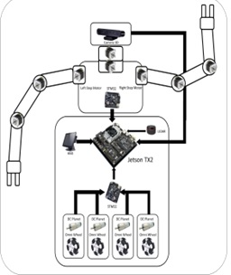 - Tay robot: 3 DOF và khớp bàn tay, thân robot 2 DOF, chân đế di chuyển sử dụng 04 động cơ DC Servo và 04 bánh Omni di chuyển đa hướng.