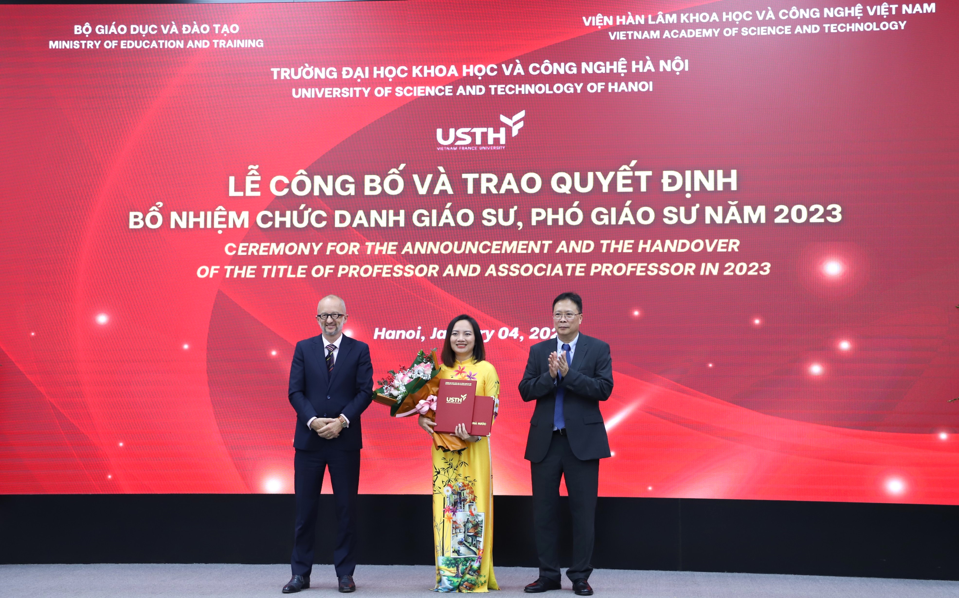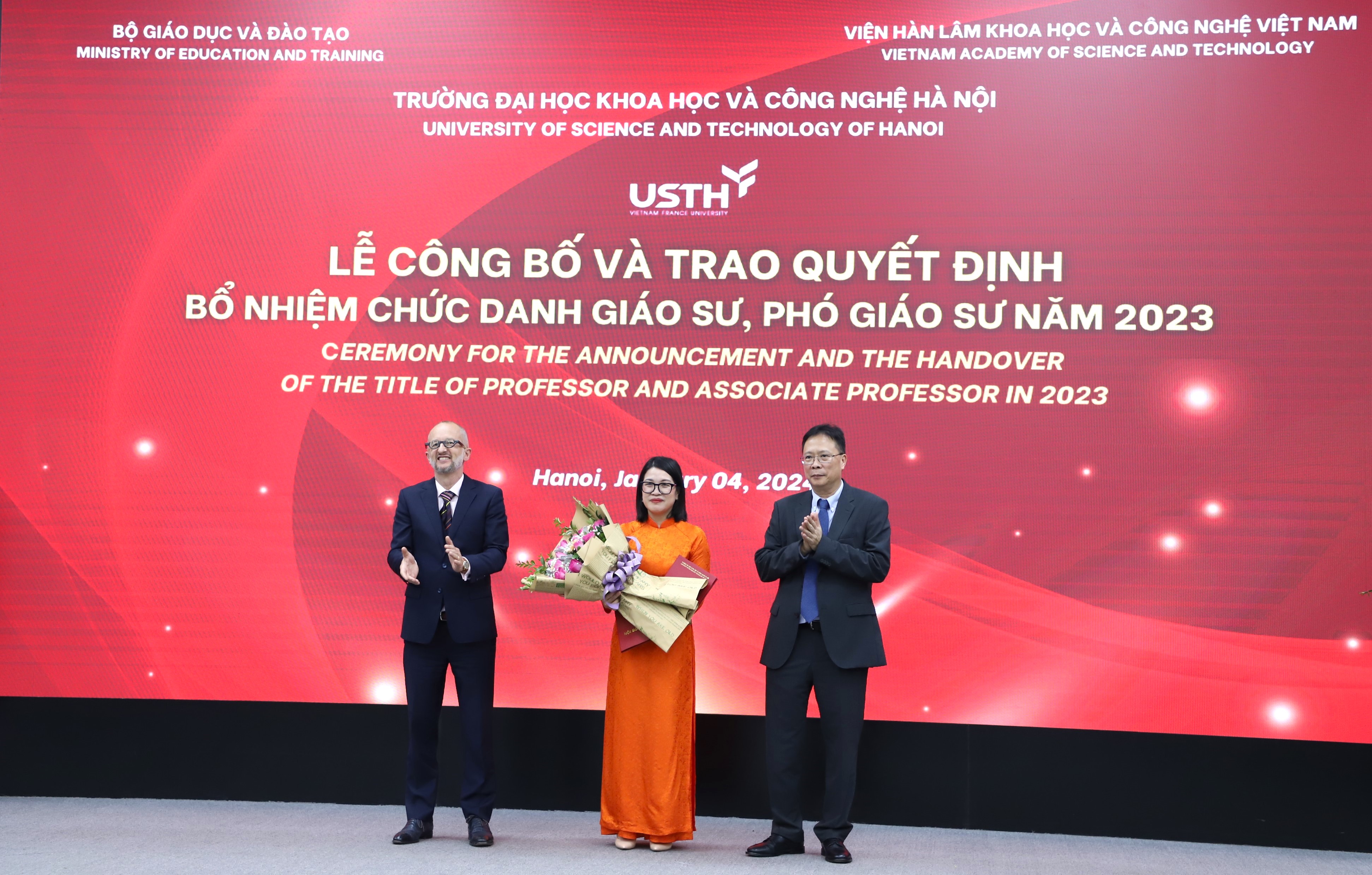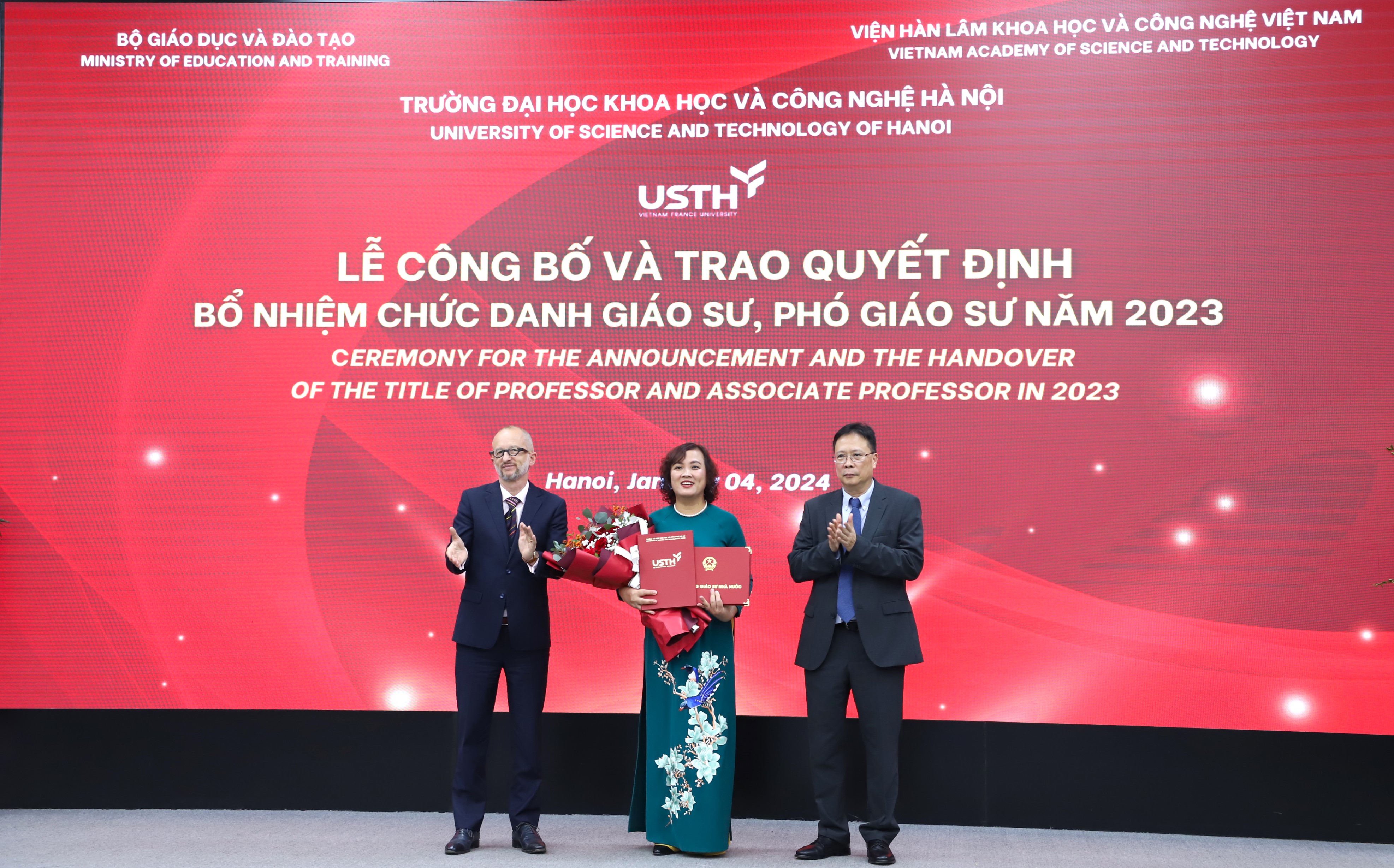 Chiều ngày 04/01/2024, Trường Đại học Khoa học và Công nghệ Hà Nội (USTH) – Viện Hàn lâm KHCNVN tổ chức Lễ trao quyết định và bổ nhiệm chức danh Giáo sư, Phó Giáo sư năm 2023. Đây là năm đầu tiên trường USTH long trọng tổ chức Lễ công bố Quyết định và Trao chứng nhận đạt tiêu chuẩn chức danh Giáo sư, Phó giáo sư, ghi nhận một dấu mốc quan trọng trên chặng đường phát triển của trường.