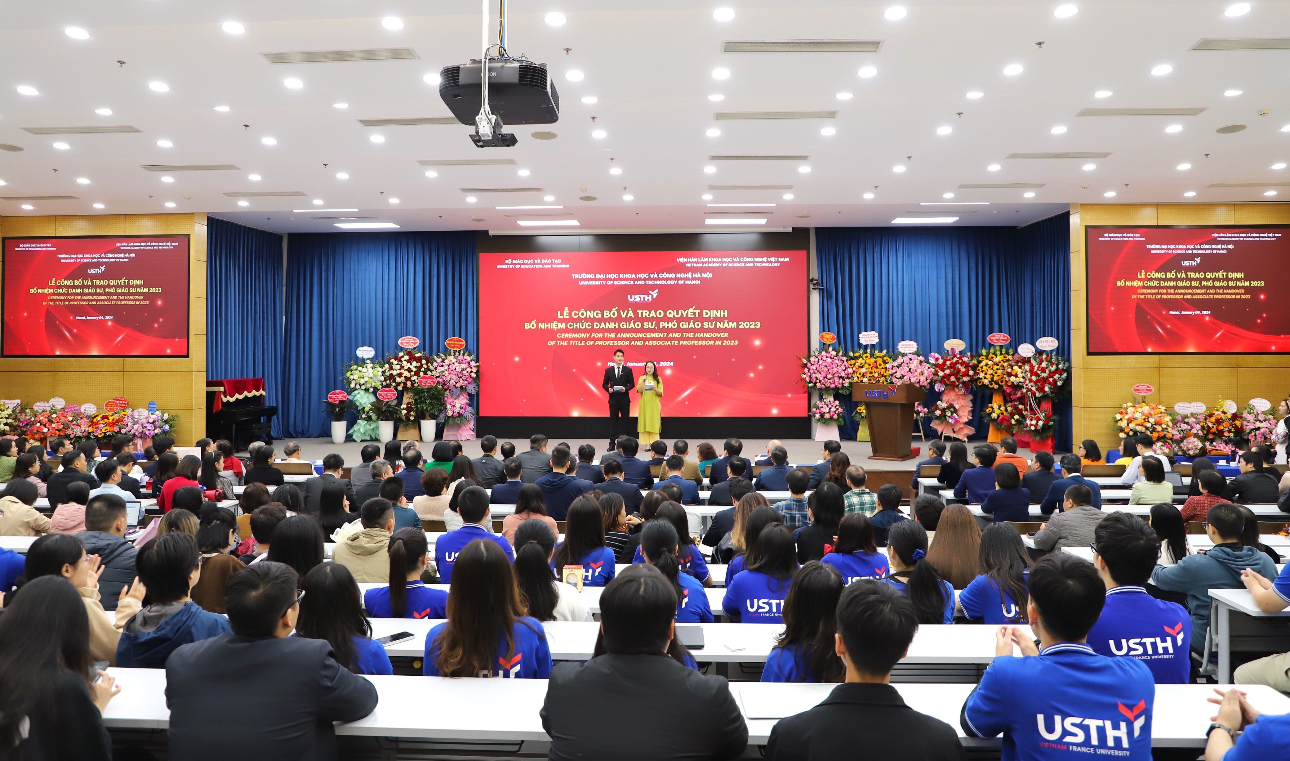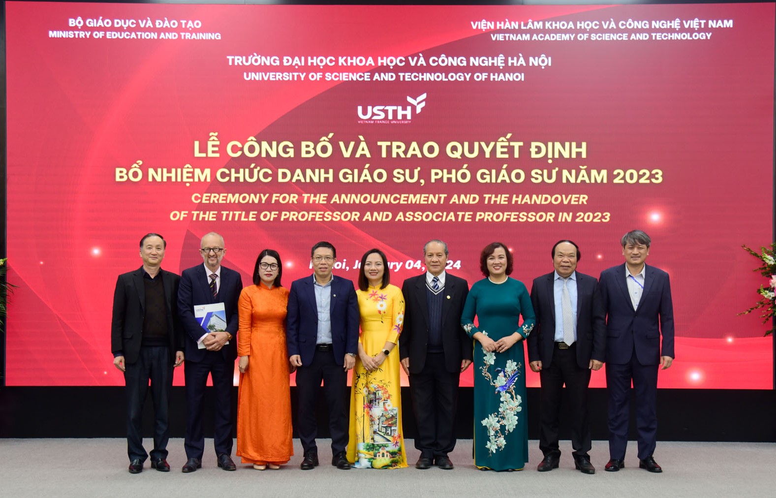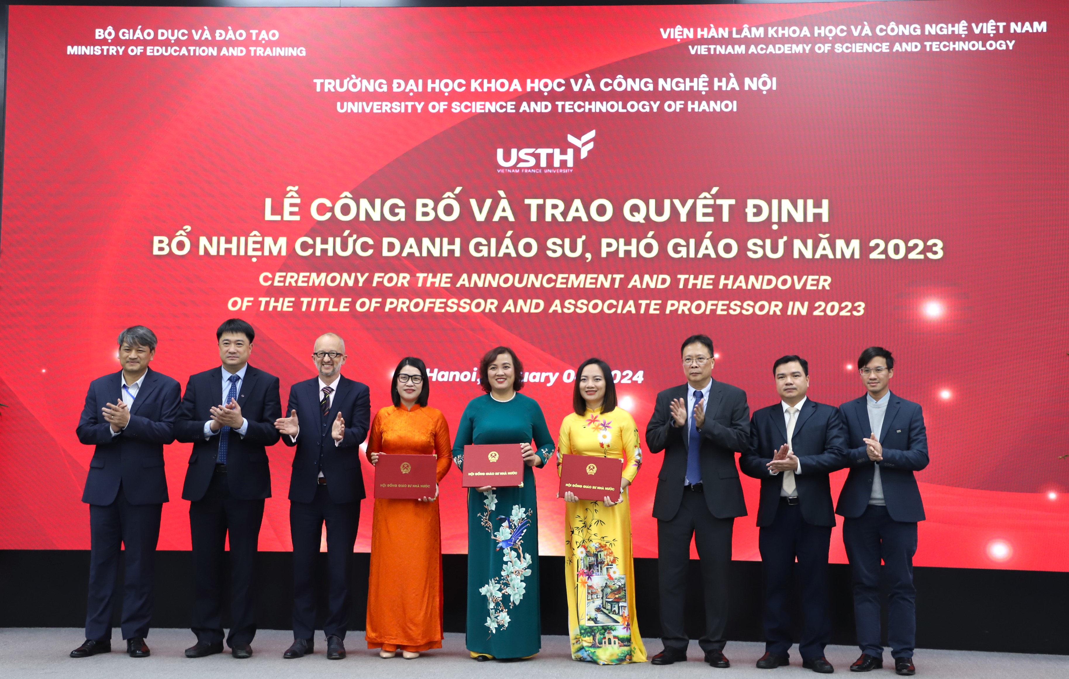 Chiều ngày 04/01/2024, Trường Đại học Khoa học và Công nghệ Hà Nội (USTH) – Viện Hàn lâm KHCNVN tổ chức Lễ trao quyết định và bổ nhiệm chức danh Giáo sư, Phó Giáo sư năm 2023. Đây là năm đầu tiên trường USTH long trọng tổ chức Lễ công bố Quyết định và Trao chứng nhận đạt tiêu chuẩn chức danh Giáo sư, Phó giáo sư, ghi nhận một dấu mốc quan trọng trên chặng đường phát triển của trường.