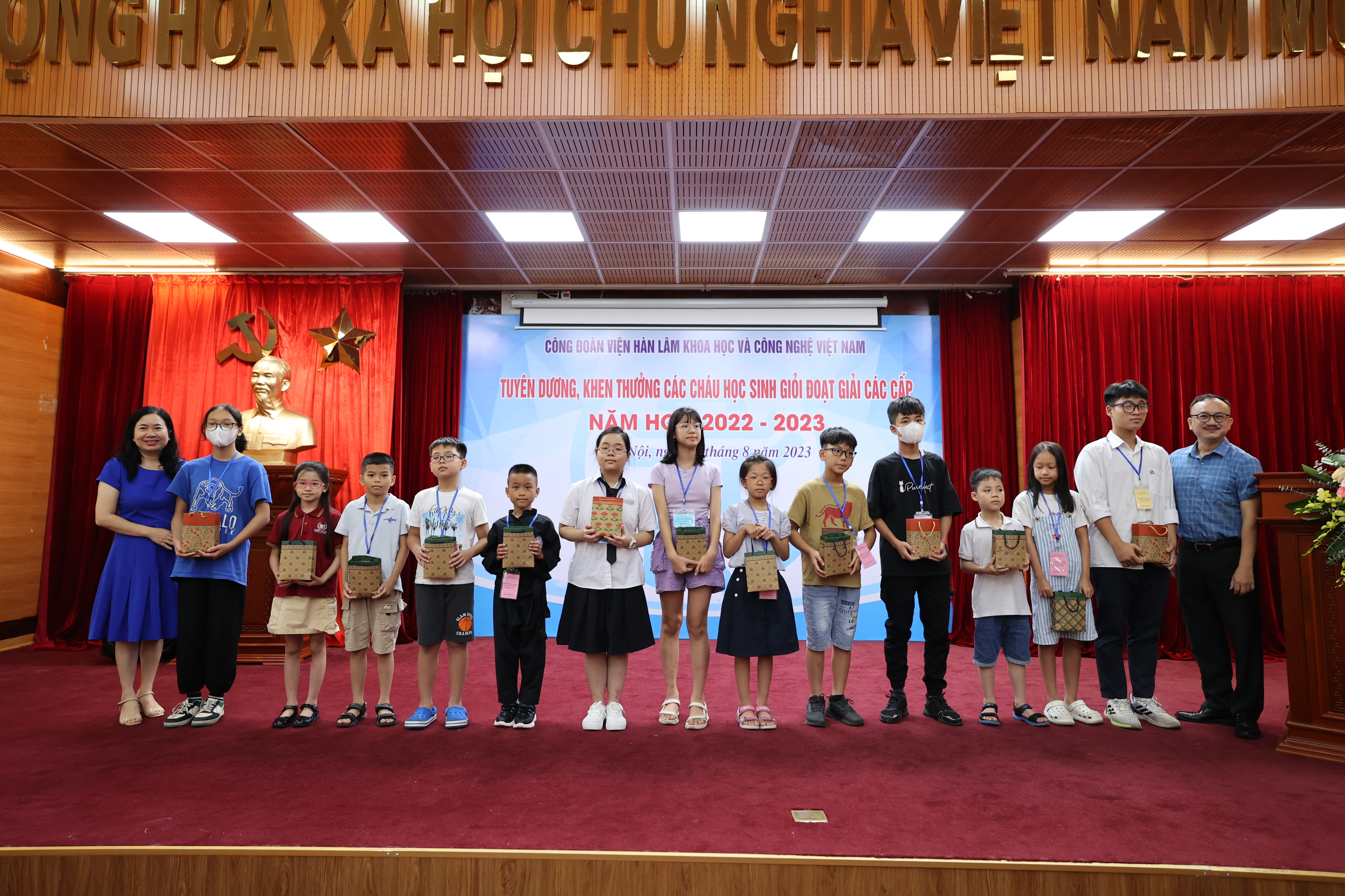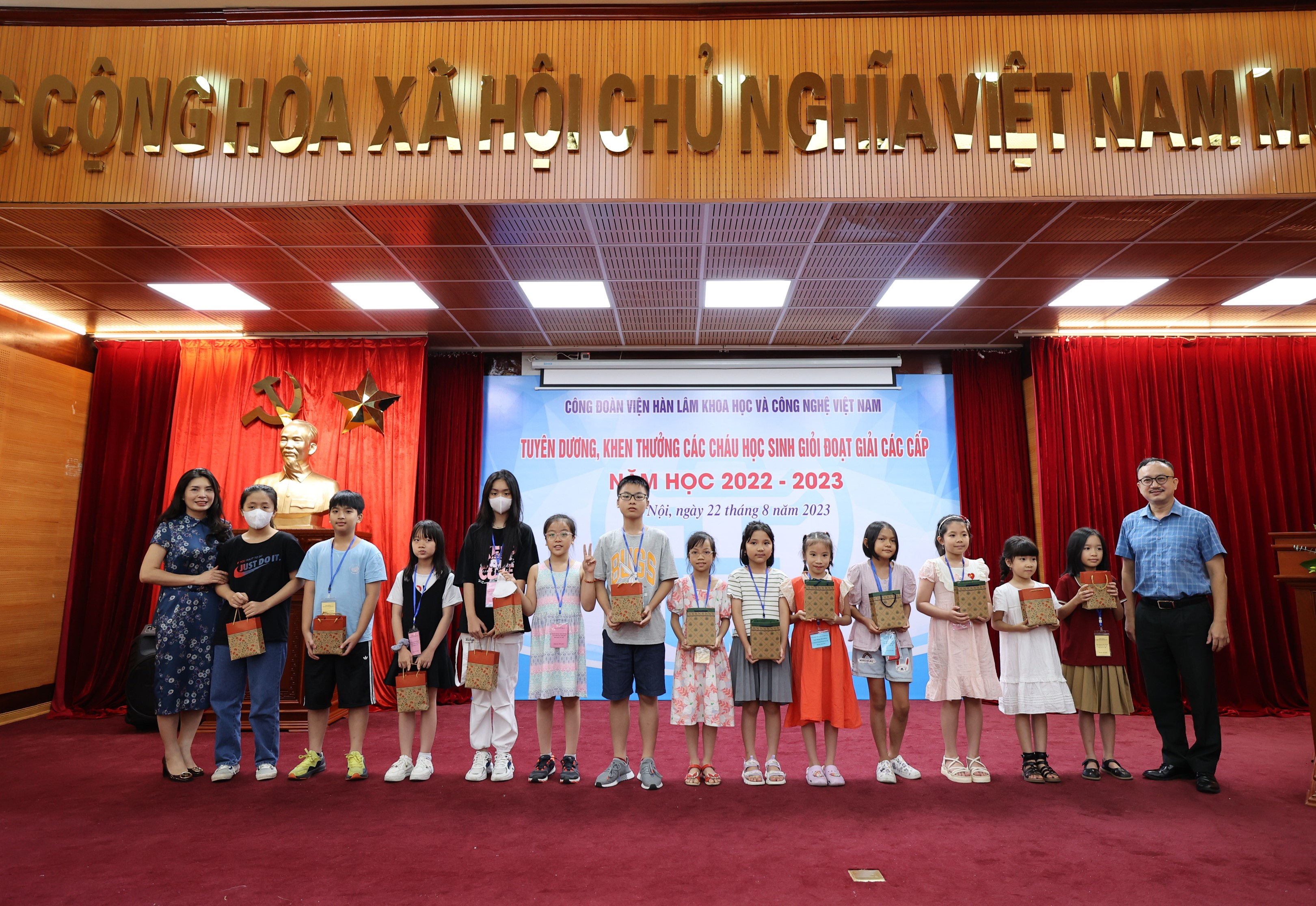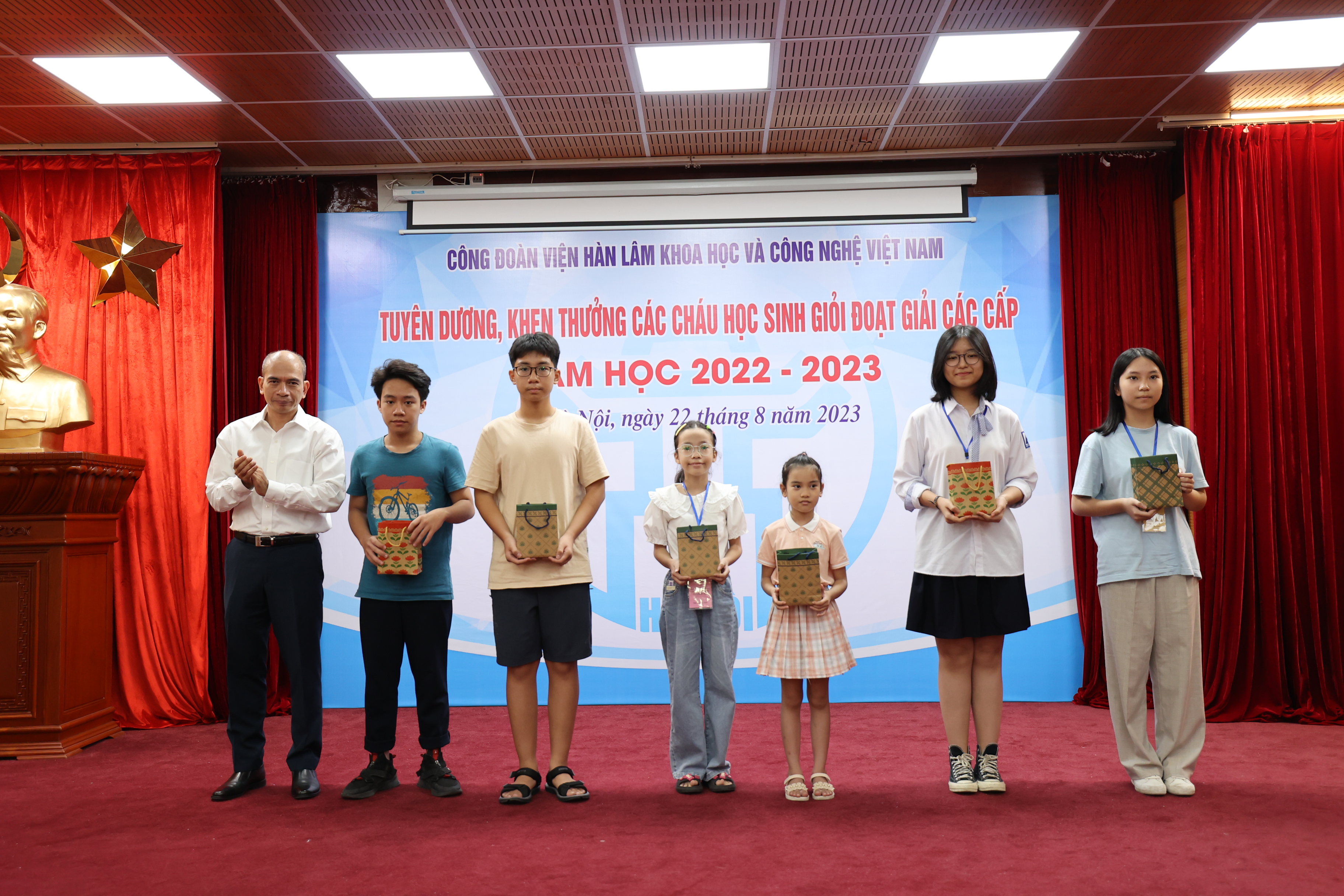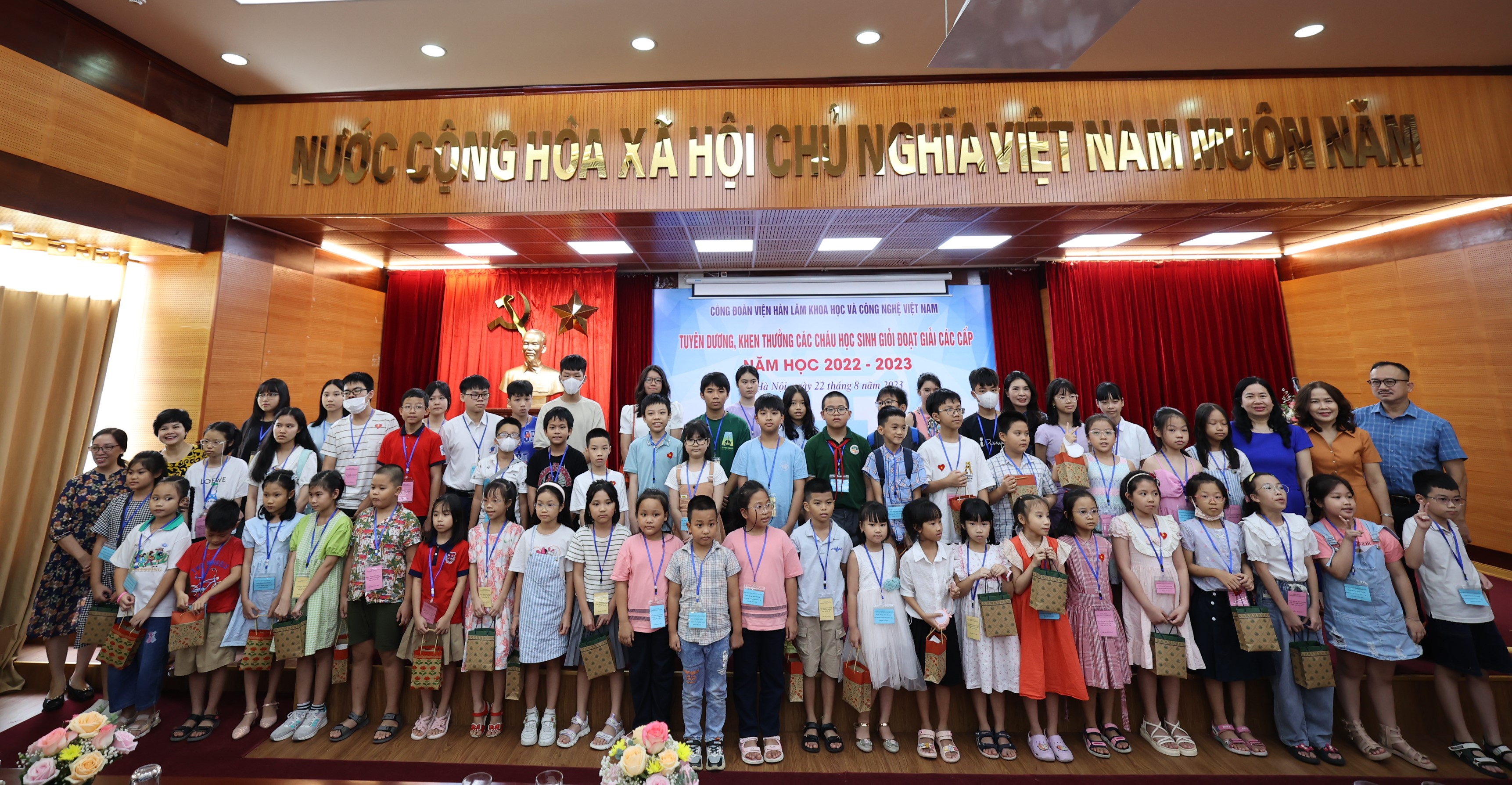 Sáng ngày 22/08/2023, Công đoàn Viện Hàn lâm Khoa học và Công nghệ Việt Nam (Công đoàn Viện Hàn lâm) tổ chức Lễ Tuyên dương, khen thưởng các cháu đạt giải học sinh giỏi các cấp năm học 2022-2023. Lễ tuyên dương, khen thưởng học sinh giỏi các cấp là hoạt động hàng năm do Công đoàn Viện Hàn lâm tổ chức nhằm khuyến khích tinh thần hiếu học, phấn đấu rèn luyện về mọi mặt của các cháu học sinh, biểu dương những tấm gương tiêu biểu có thành tích xuất sắc trong học tập của con em công đoàn viên, đồng thời thể hiện sự quan tâm sâu sắc của lãnh đạo Viện Hàn lâm đối với thế hệ tương lai của cán bộ Viện Hàn lâm