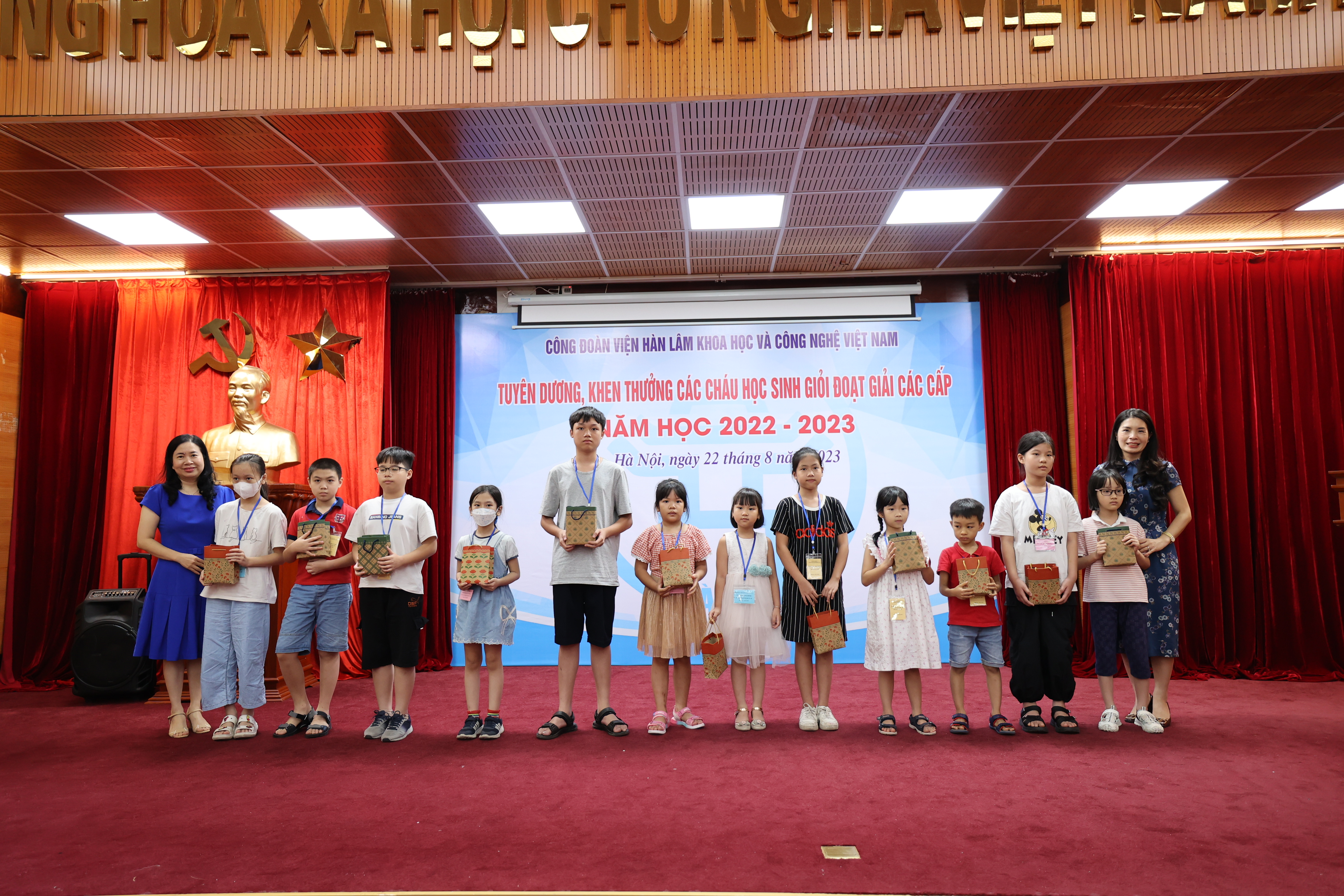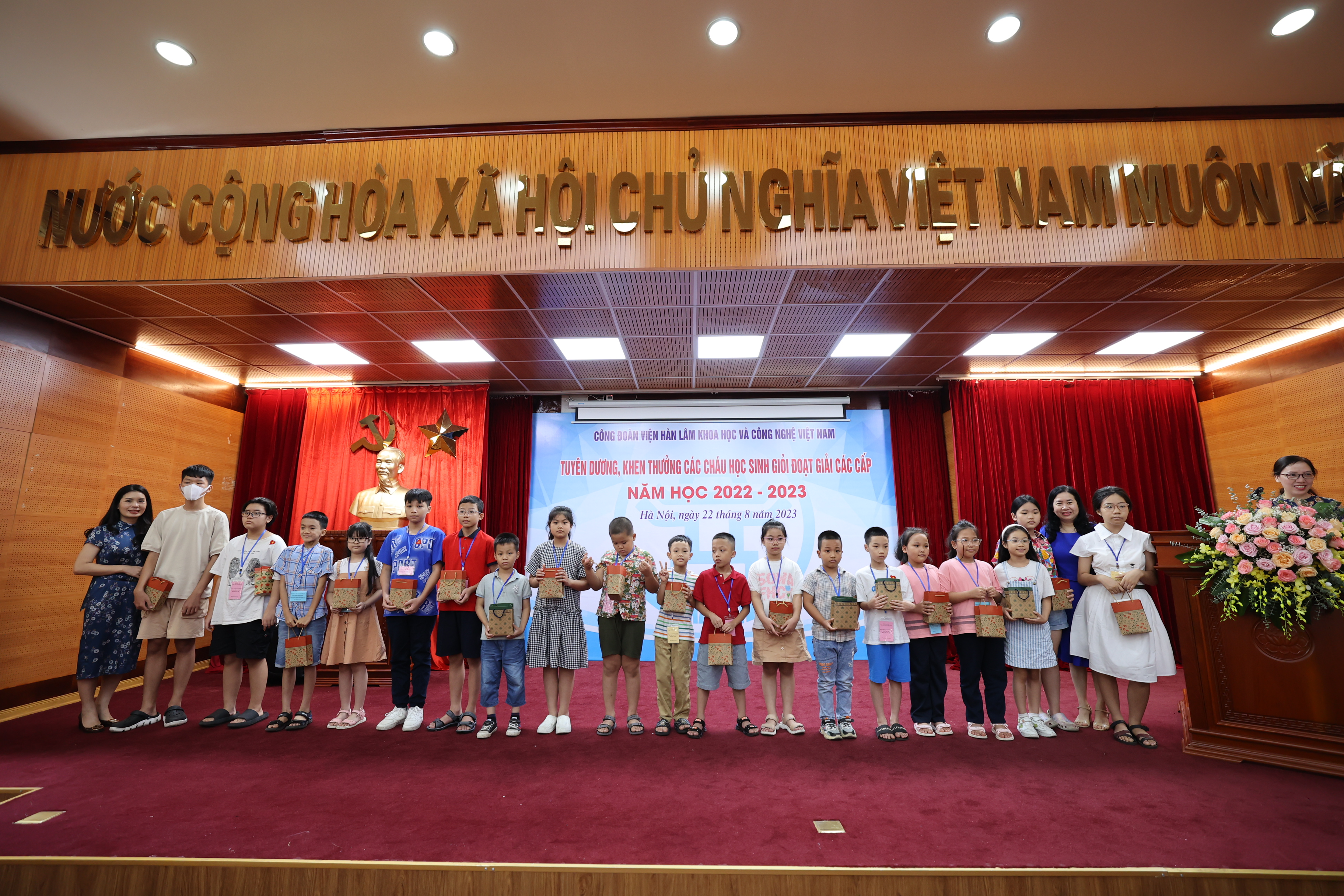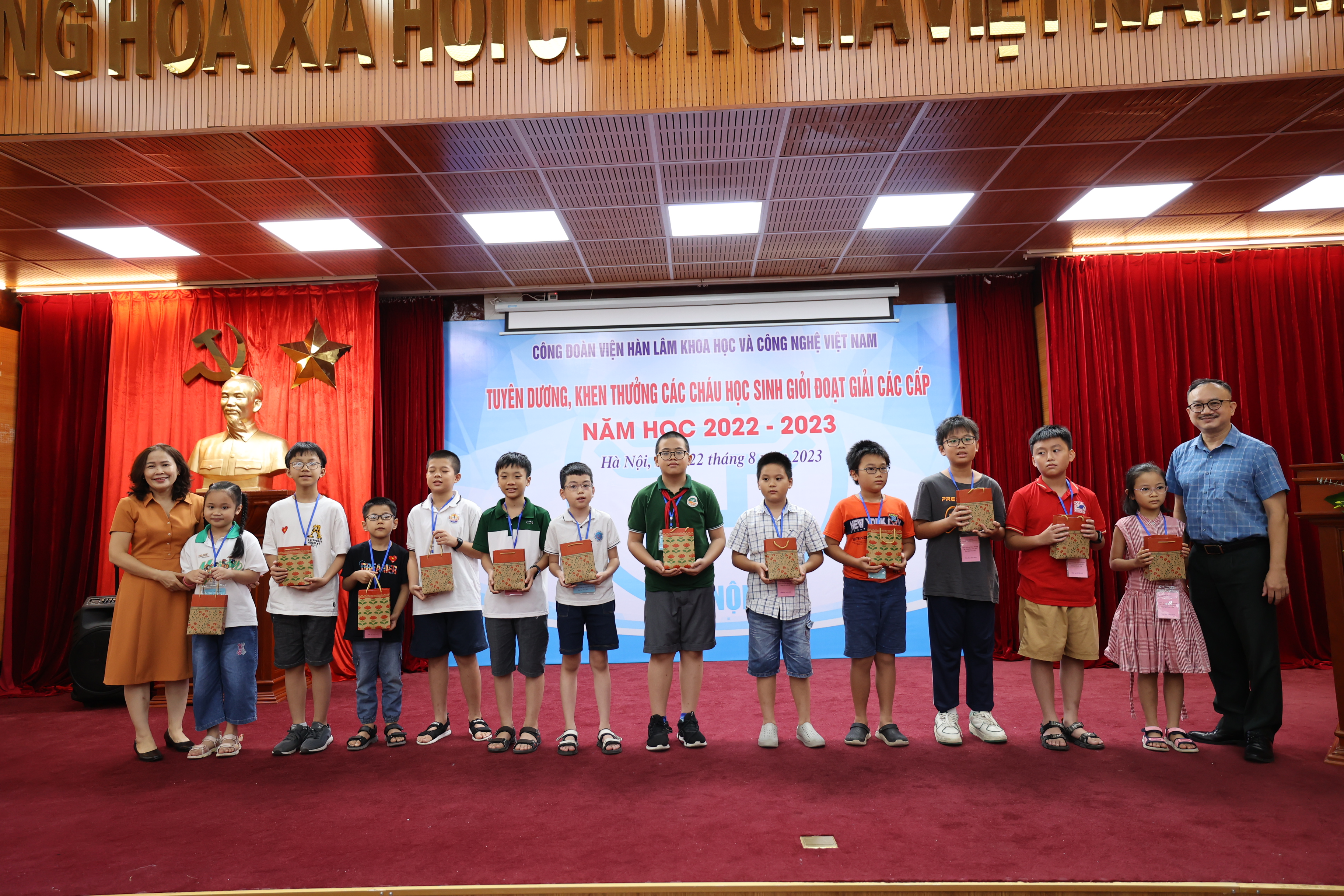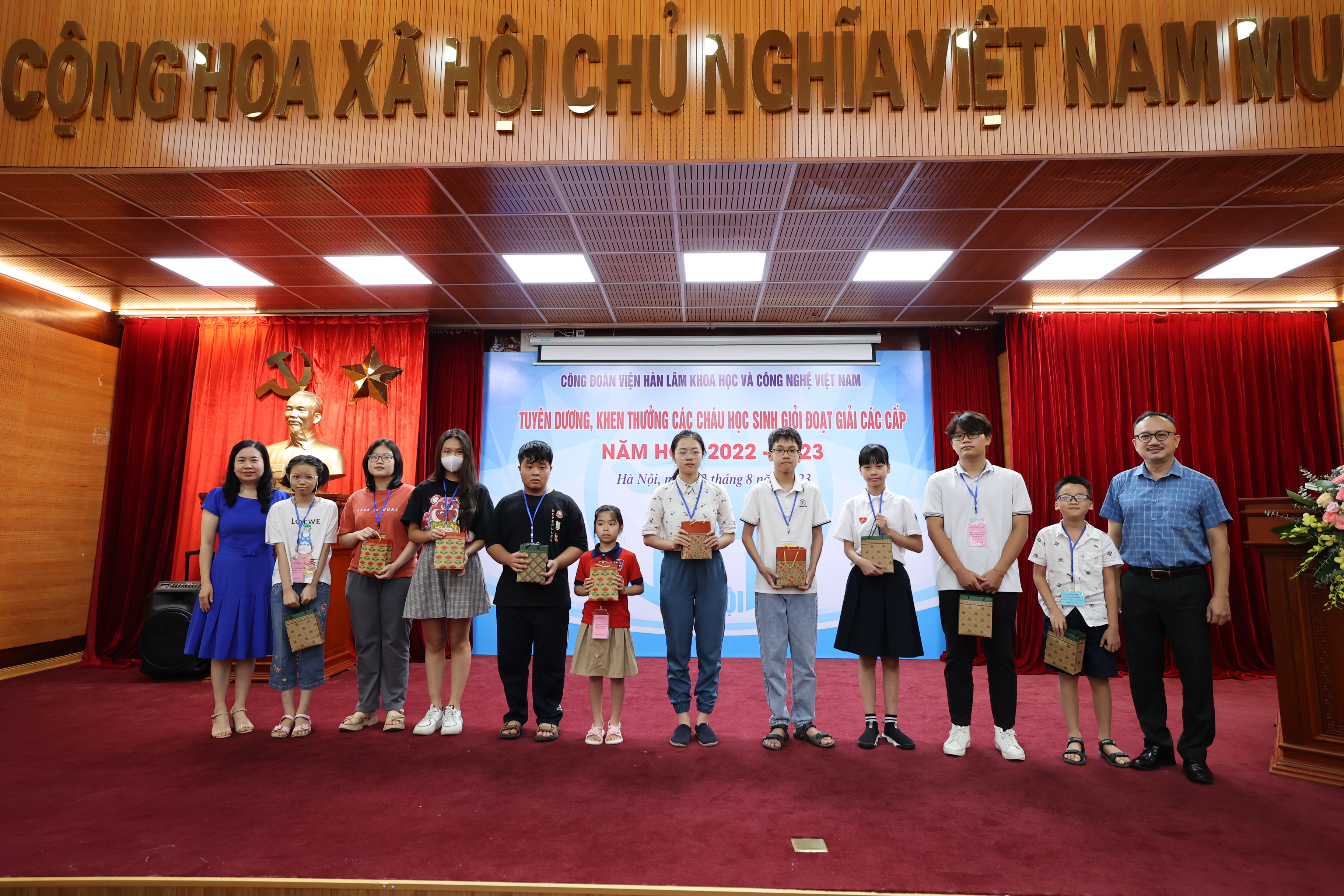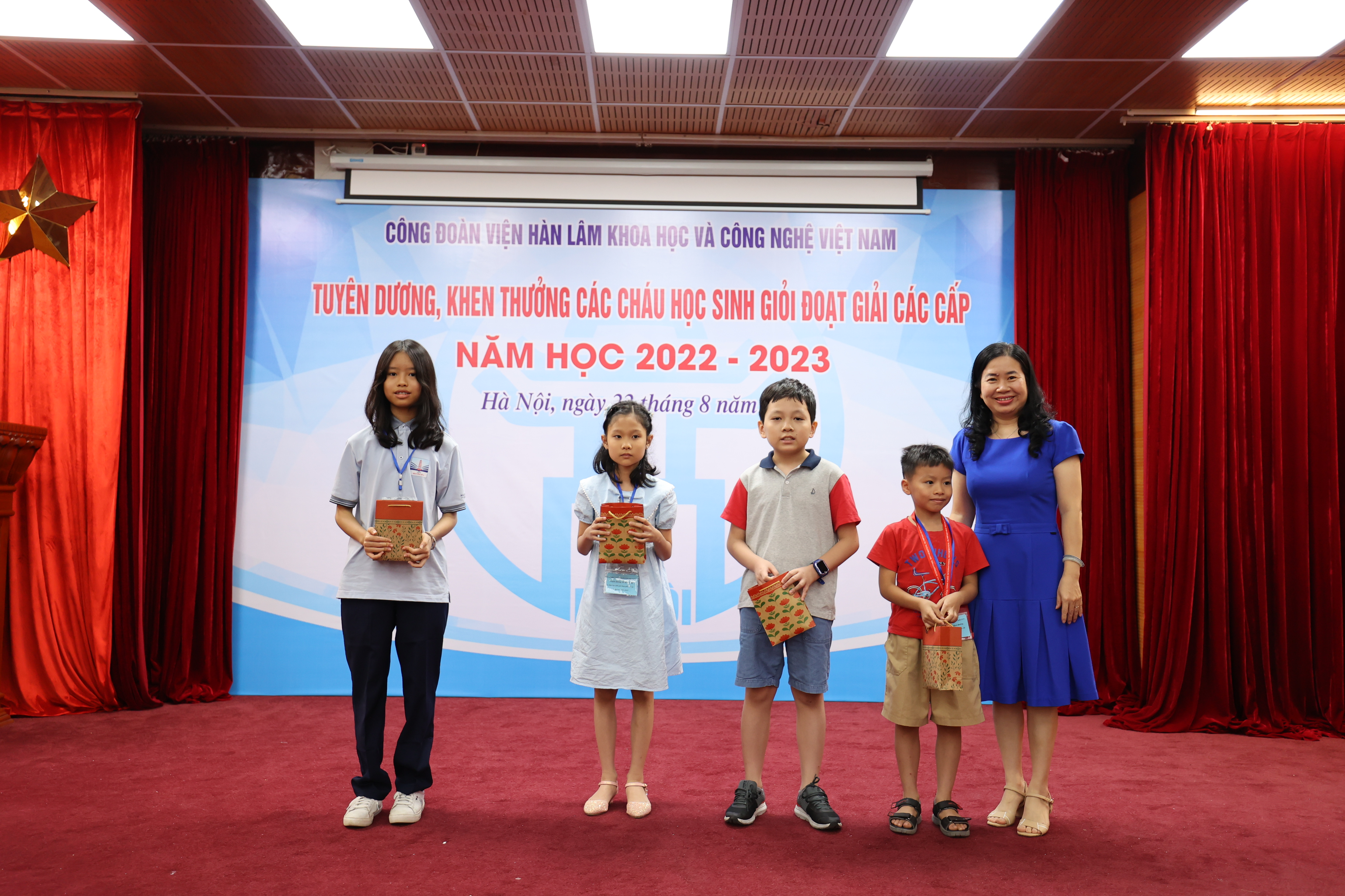 Sáng ngày 22/08/2023, Công đoàn Viện Hàn lâm Khoa học và Công nghệ Việt Nam (Công đoàn Viện Hàn lâm) tổ chức Lễ Tuyên dương, khen thưởng các cháu đạt giải học sinh giỏi các cấp năm học 2022-2023. Lễ tuyên dương, khen thưởng học sinh giỏi các cấp là hoạt động hàng năm do Công đoàn Viện Hàn lâm tổ chức nhằm khuyến khích tinh thần hiếu học, phấn đấu rèn luyện về mọi mặt của các cháu học sinh, biểu dương những tấm gương tiêu biểu có thành tích xuất sắc trong học tập của con em công đoàn viên, đồng thời thể hiện sự quan tâm sâu sắc của lãnh đạo Viện Hàn lâm đối với thế hệ tương lai của cán bộ Viện Hàn lâm