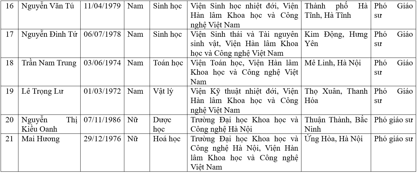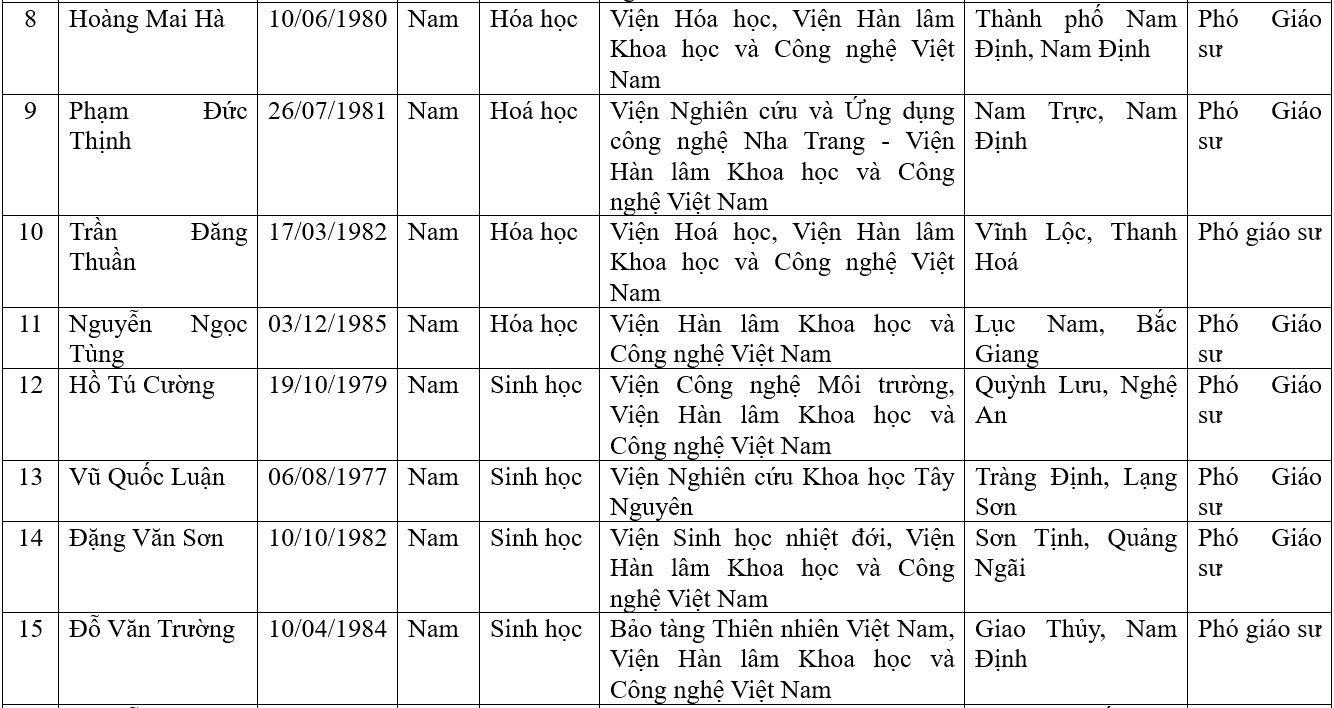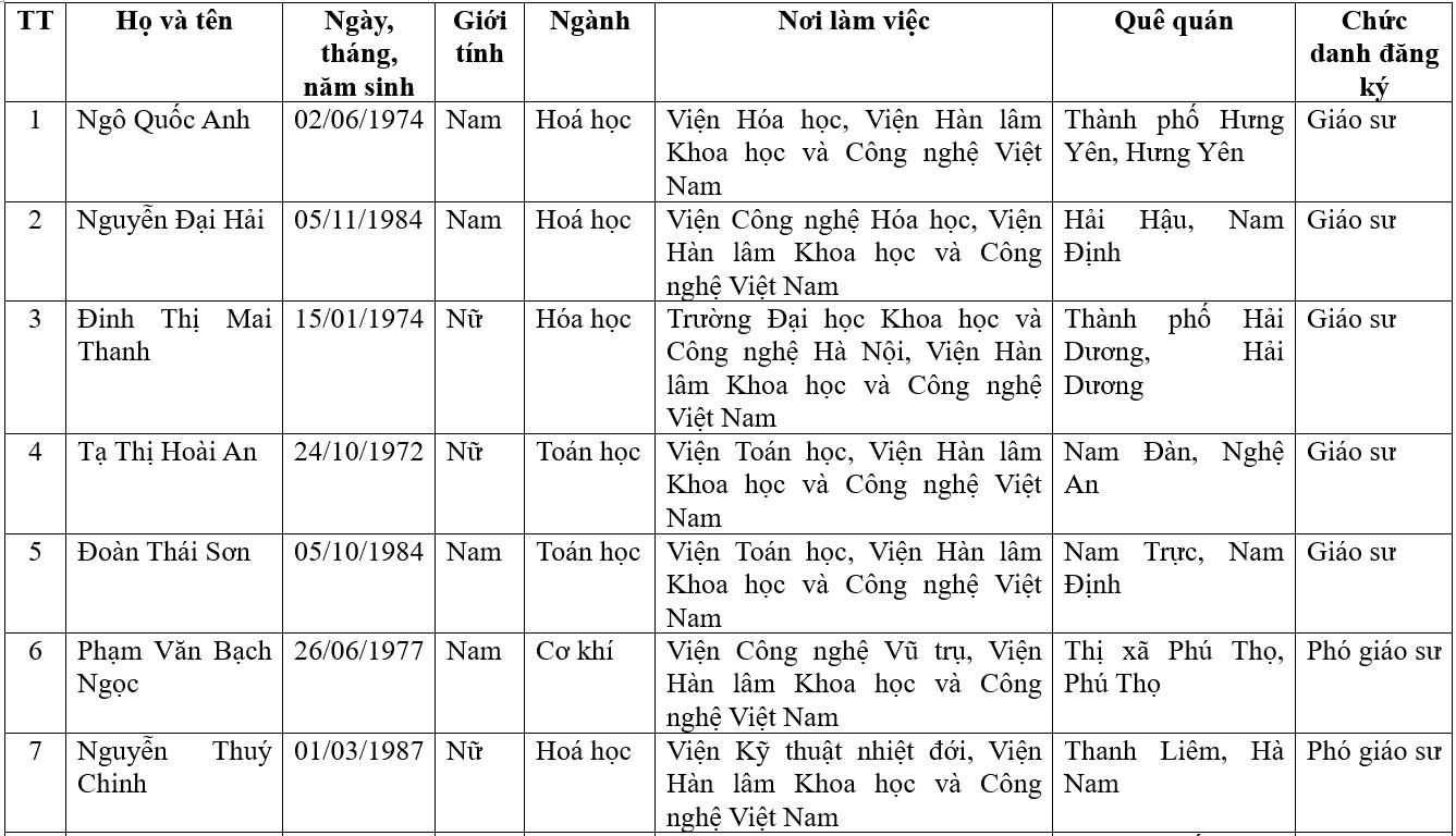 DANH SÁCH ỨNG VIÊN CHỨC DANH GIÁO SƯ, PHÓ GIÁO SƯ CỦA VIỆN HÀN LÂM KHOA HỌC VÀ CÔNG NGHỆ VIỆT NAM NĂM 2023, ĐƯỢC HỘI ĐỒNG CHỨC DANH GIÁO SƯ NHÀ NƯỚC CÔNG BỐ