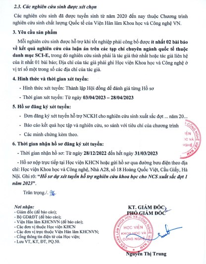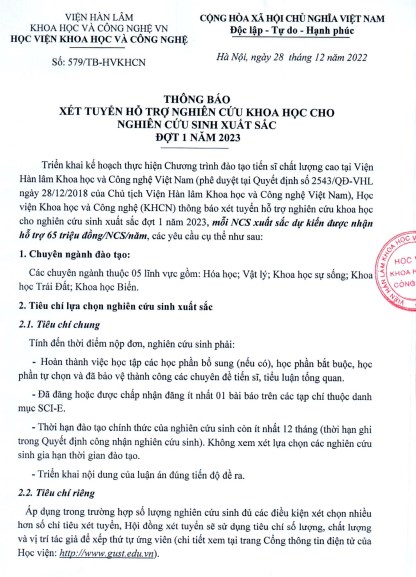 Ngày 28 tháng 12 năm 2022 Học viện Khoa học và Công nghệ ban hành thông báo về xét tuyển hỗ trợ nghiên cứu khoa học cho nghiên cứu sinh xuất sắc đợt 1 năm 2023.