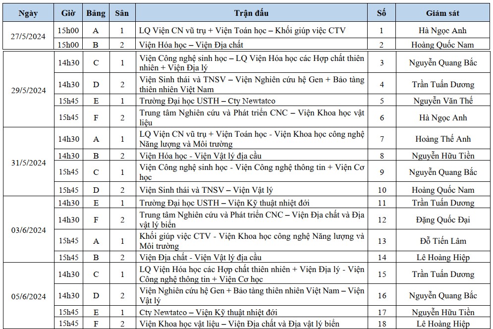 Chiều ngày 27/5/2024, tại sân bóng 361 Hoàng Quốc Việt đã diễn ra Lễ Khai mạc Giải bóng đá Viện Hàn lâm Khoa học và Công nghệ Việt Nam (Viện Hàn lâm) khu vực phía Bắc năm 2024.